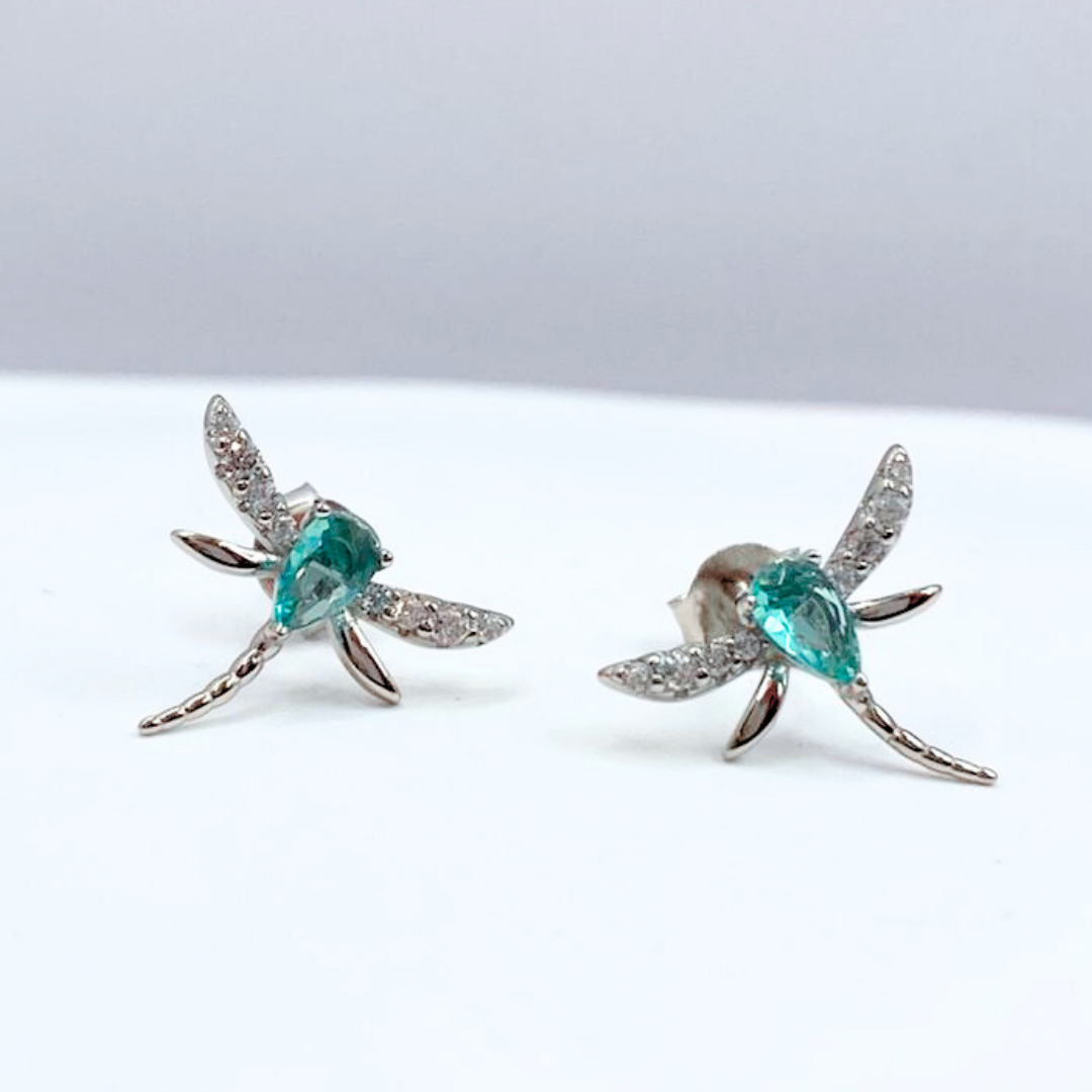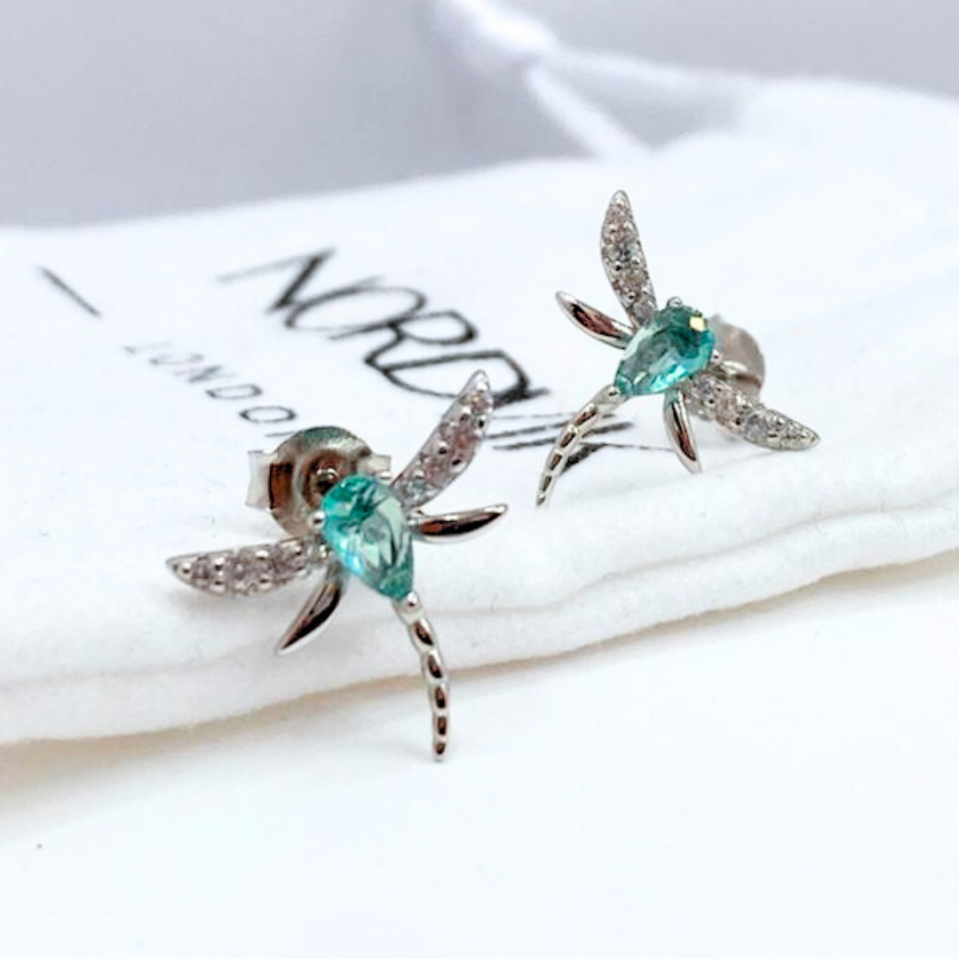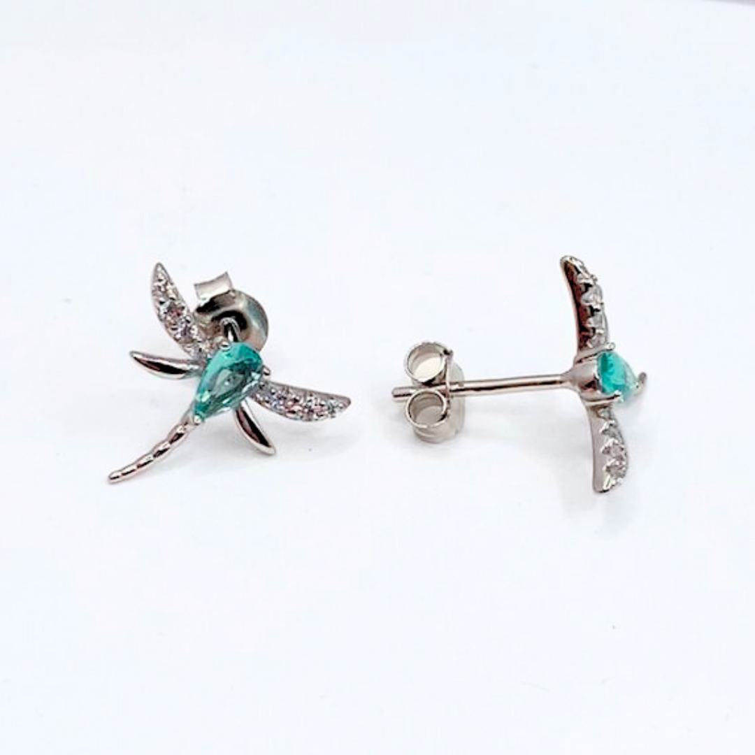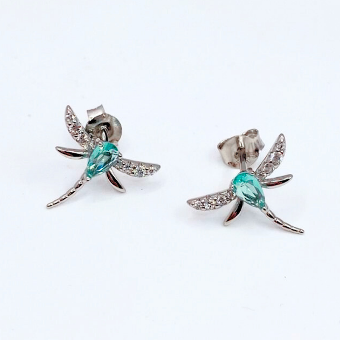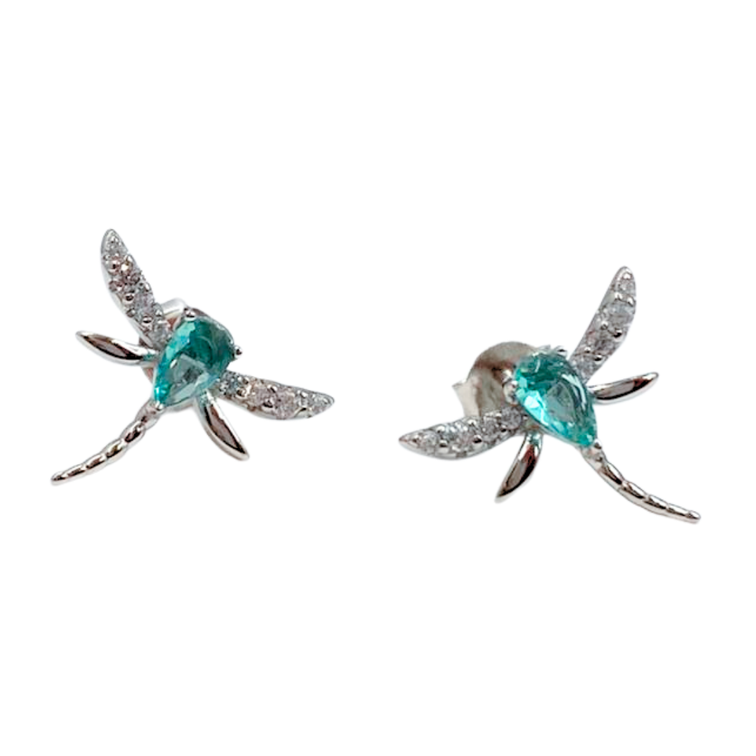 Un toque natural y encantador. Estos aros bañados en plata 925 combinan la delicadeza de una libélula con el brillo sutil de la piedra aguamarina y el circón blanco, creando una joya especial y llena de significado.