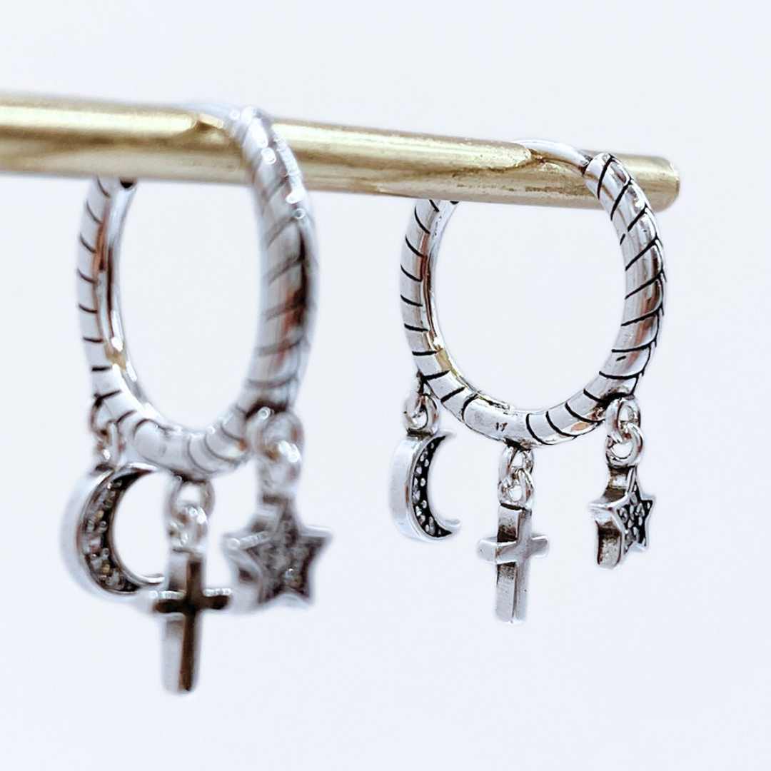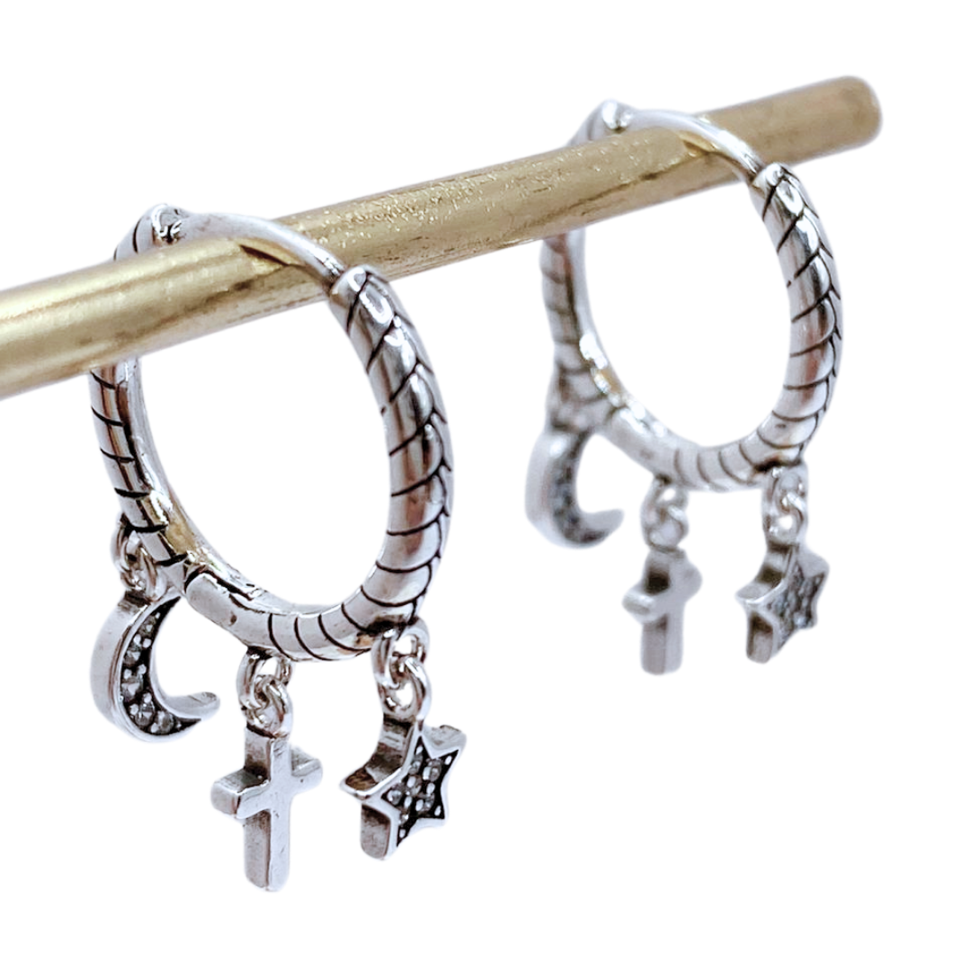 Dale un toque celestial a tu look con estos aros argolla bañados en Plata 925, adornados con circones blancos. Su diseño, que combina una estrella, luna y cruz, aporta un giro único y lleno de simbolismo a tu estilo diario. Perfectos para regalar o darte un capricho con algo lleno de brillo y significado.