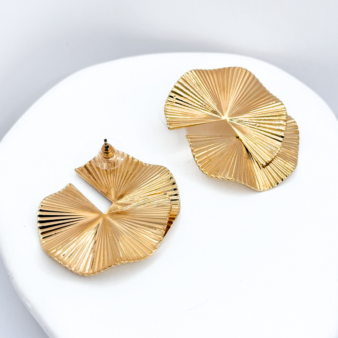 Destaca con estos aros dorados en forma de abanico, perfectos para aportar un toque retro y sofisticado a tu look. Con su diseño único y elegante, son ideales para cualquier ocasión especial.