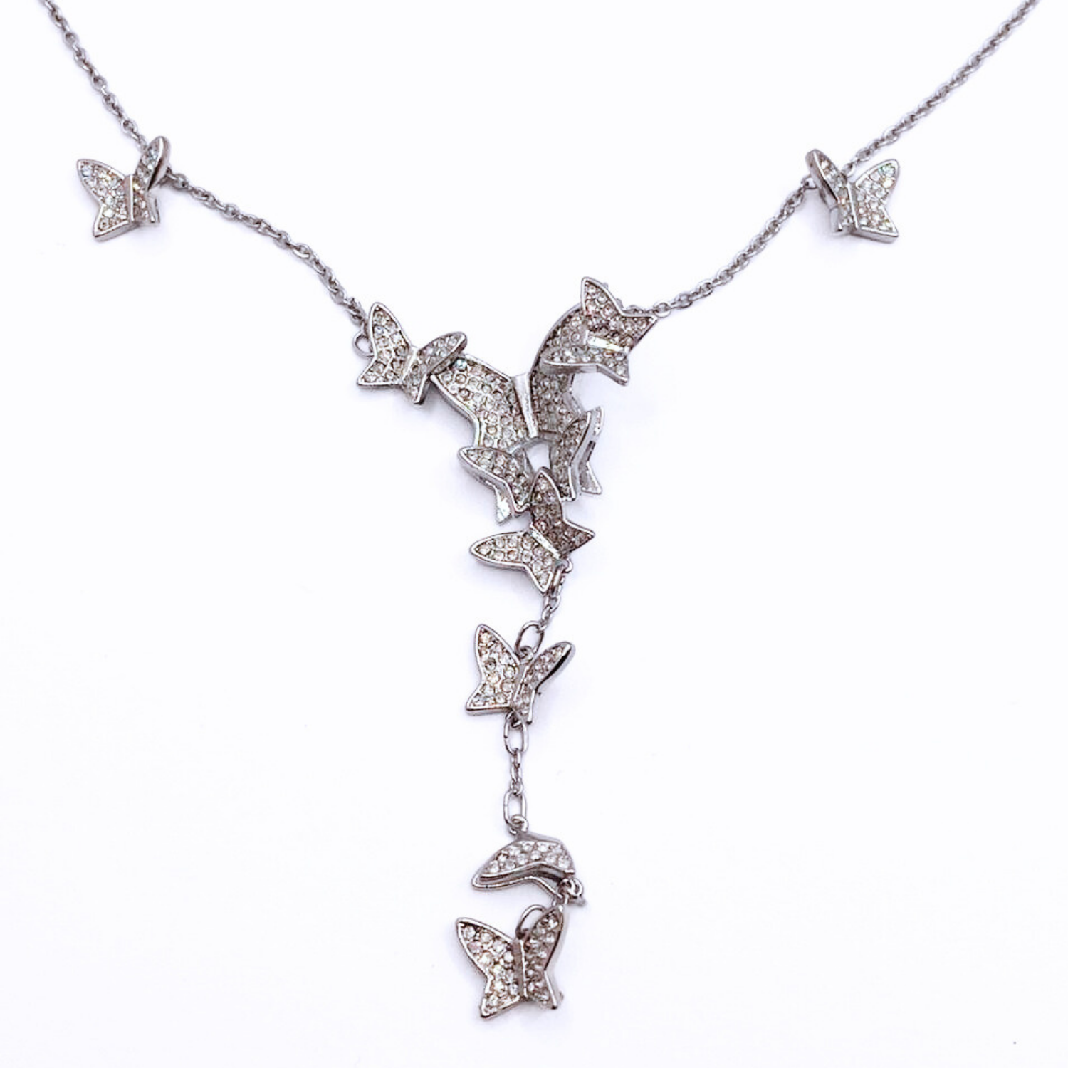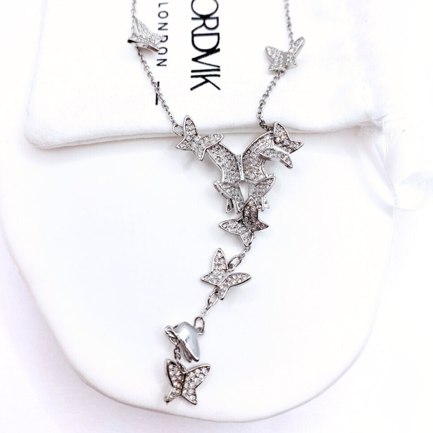 Un diseño lleno de brillo y movimiento. Nuestro Collar Mil Mariposas combina circonitas pavé con un acabado enchapado en rodio, logrando una pieza sutil y llamativa a la vez.