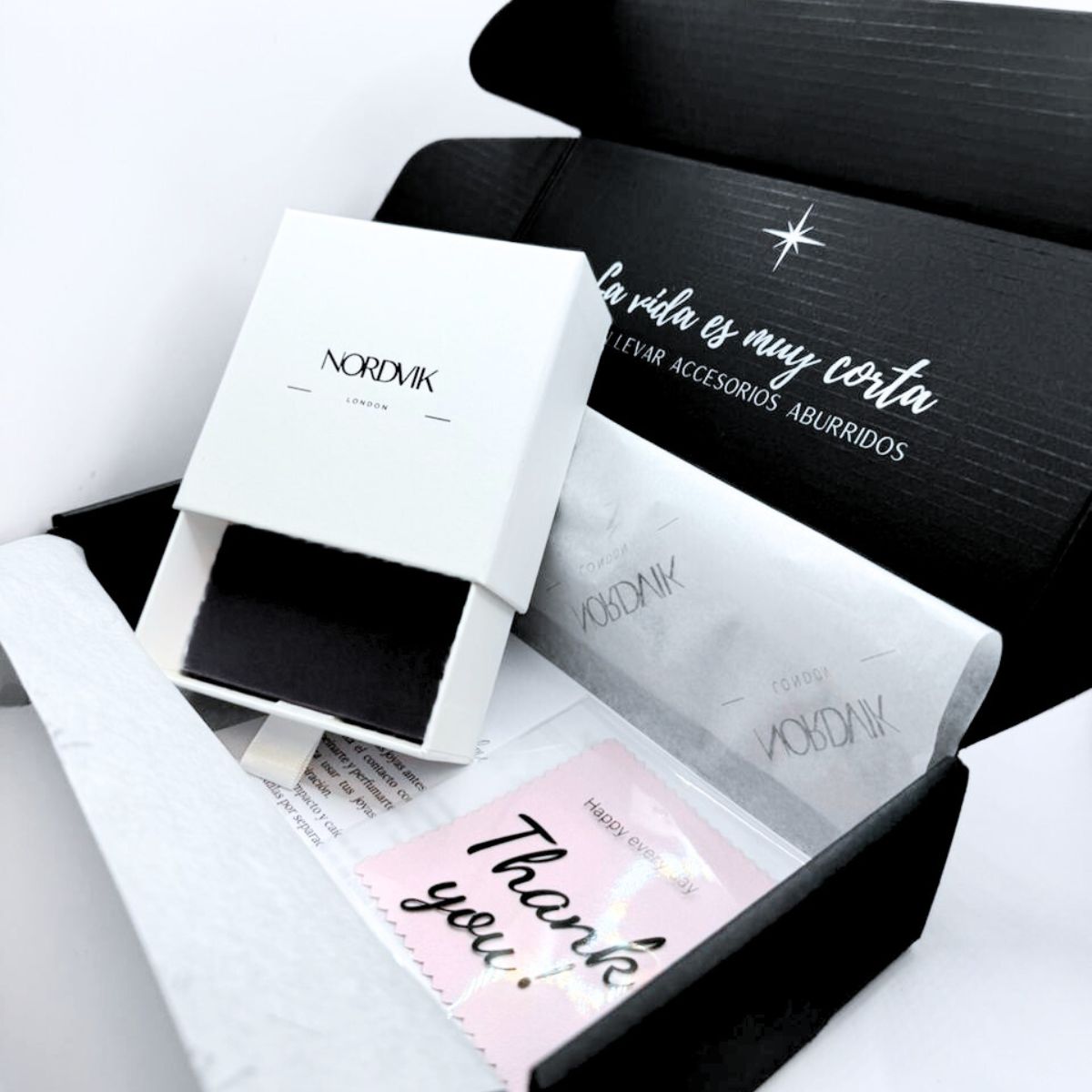 · 1 x Caja de regalo Nordvik, que incluye lo anterior más una tarjeta de cuidados y un paño para limpiar las joyas