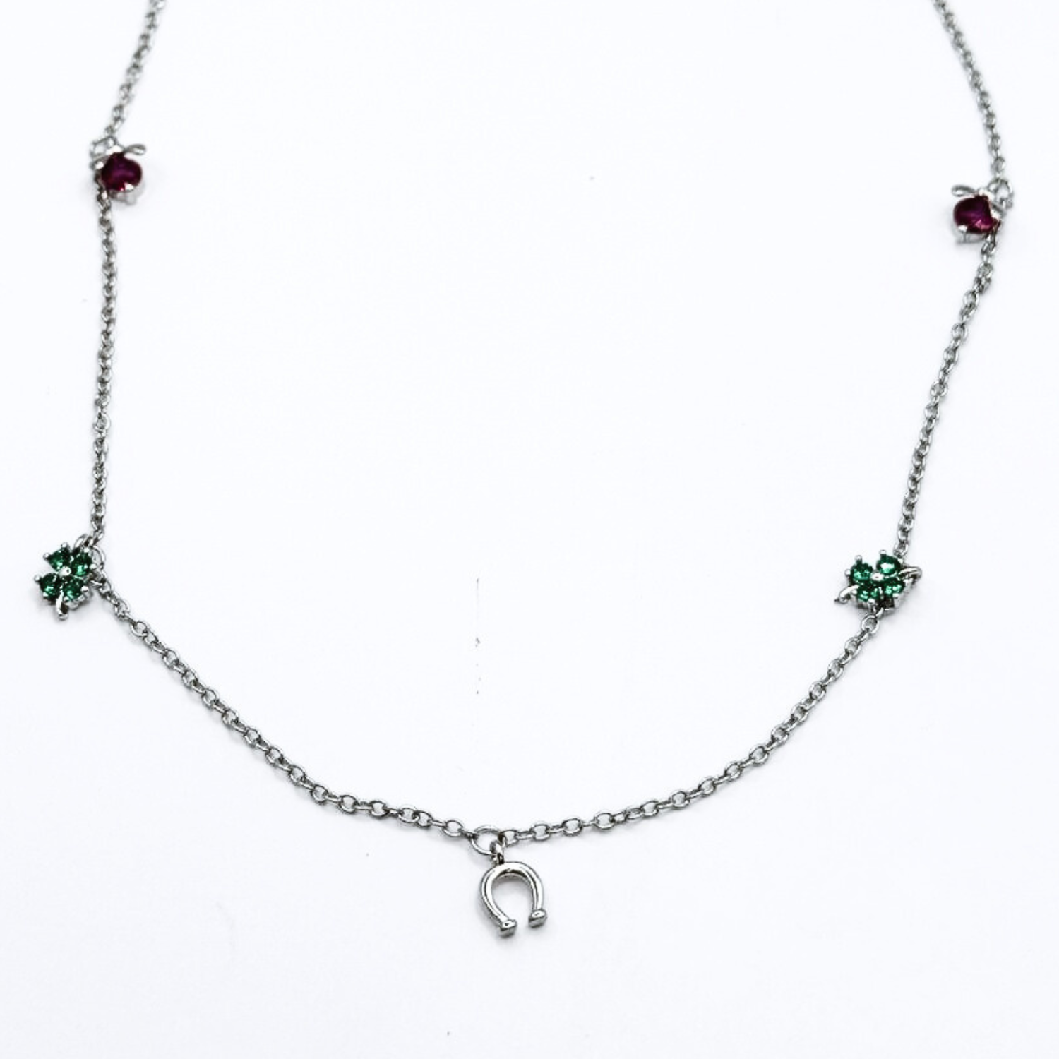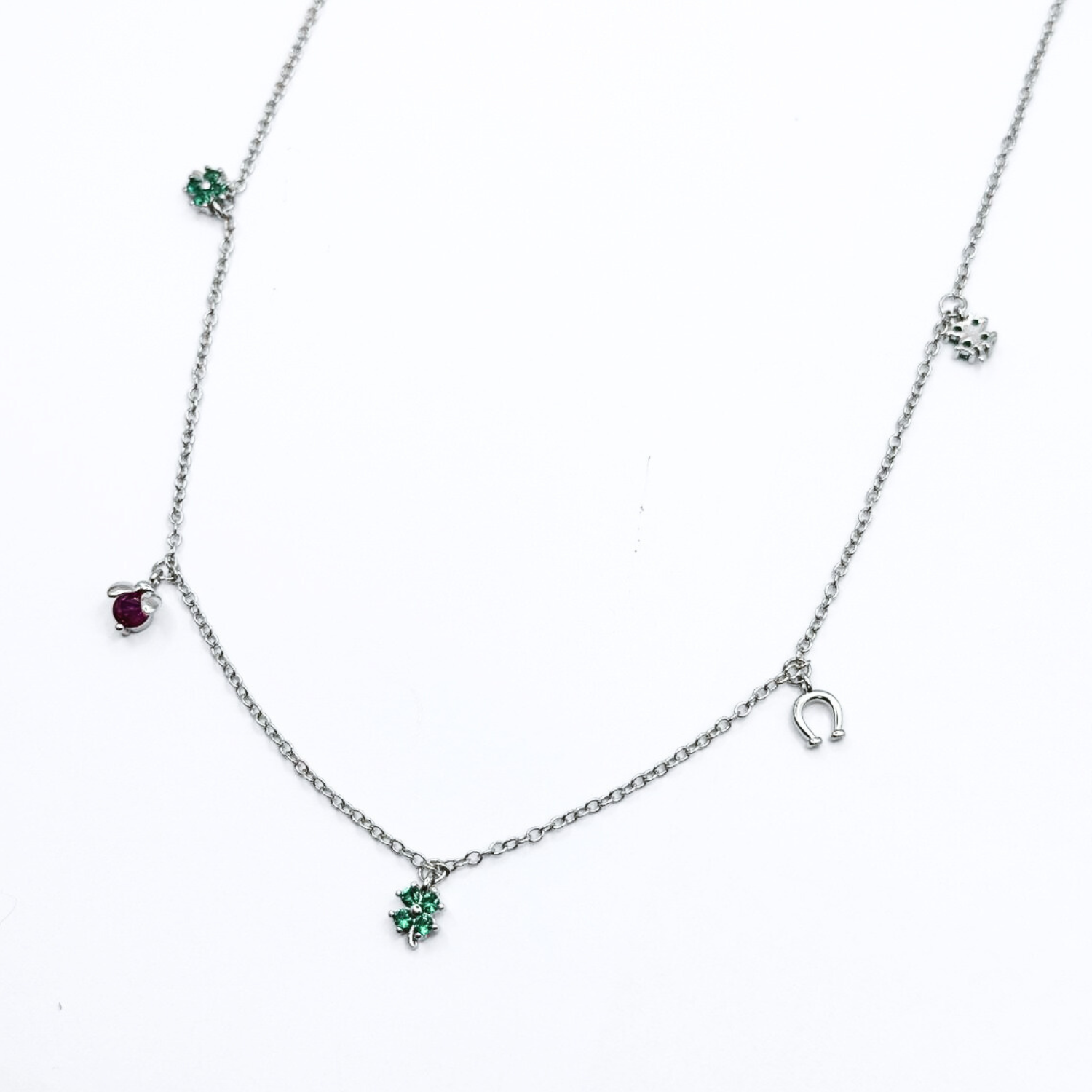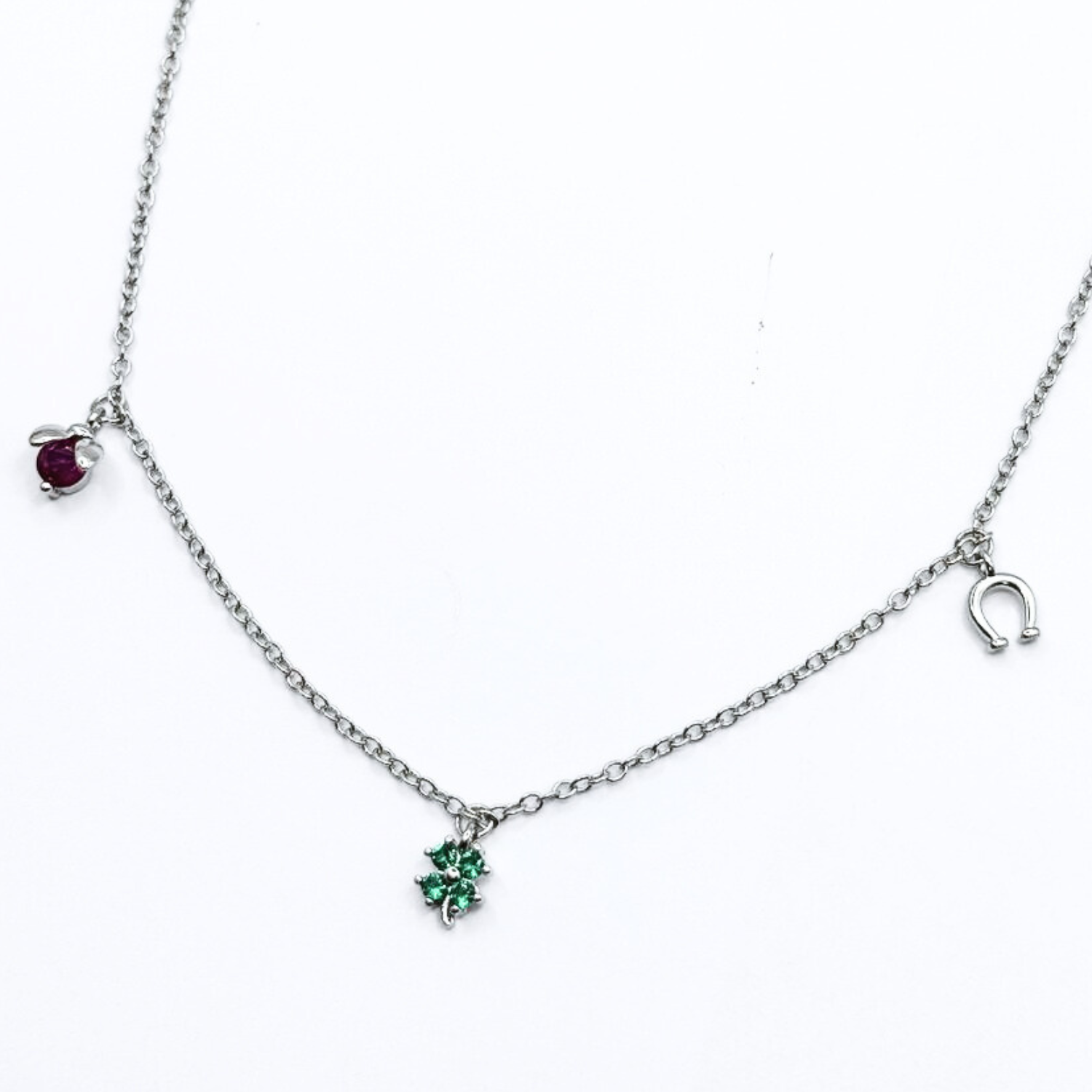 Un amuleto de buena suerte que puedes llevar siempre contigo. Este collar en Plata 925 combina dijes de chinitas rojas, tréboles de cuatro hojas y una herradura central, símbolos de fortuna y protección. Su diseño delicado y lleno de significado lo hace perfecto para el día a día.