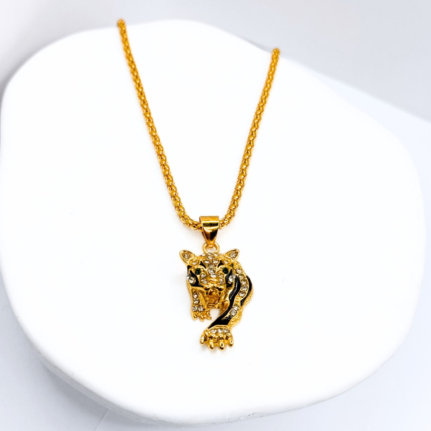 Poder y elegancia en una sola pieza. Este collar con dije de leopardo al acecho destaca por sus detalles en negro y circonitas, realzando su mirada intensa y su porte imponente. La cadena tubular complementa el diseño con un toque robusto y llamativo.