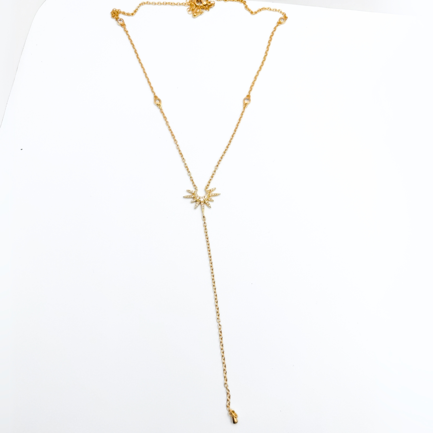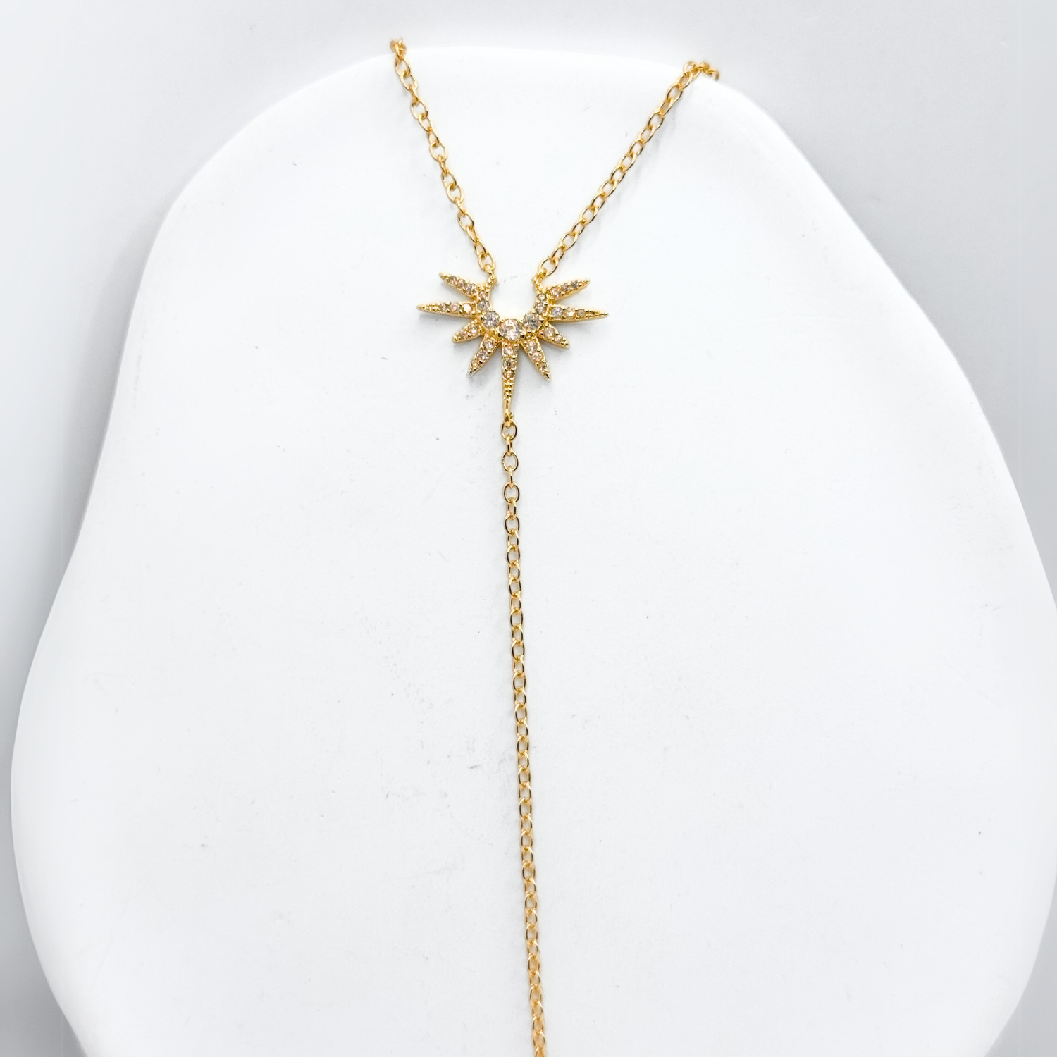 Un diseño celestial que equilibra luz y sombra. Este collar en plata 925 bañada en oro 18K presenta una luna en el centro, rodeada de destellos de sol con circonitas brillantes. Su cadena colgante aporta un toque estilizado y llamativo.