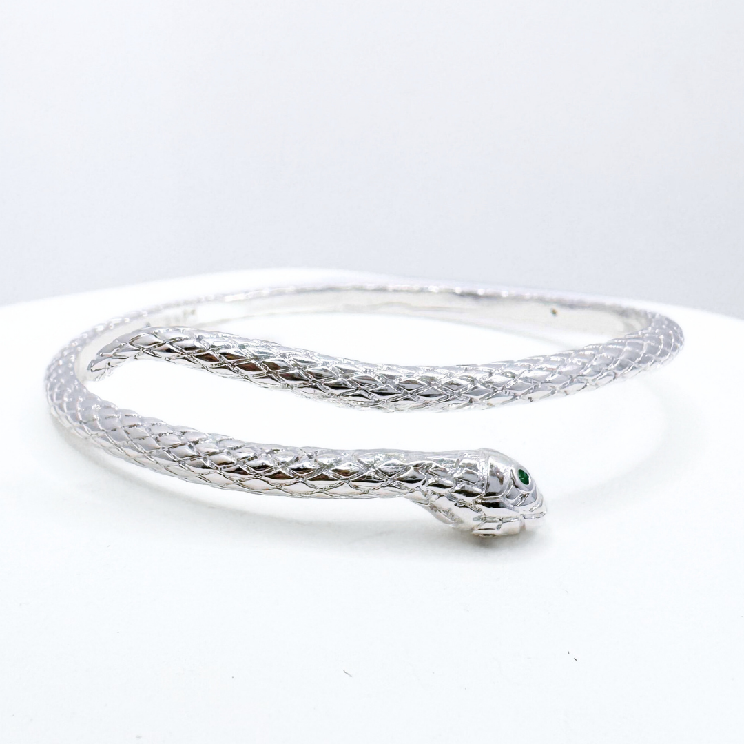 Aporta un toque audaz y místico a tu estilo con esta pulsera de serpiente tallada. Su diseño único, con ojos en circonita verde, simboliza protección y poder. Fabricada en plata 925, su estructura semirígida permite ajustarse cómodamente a la muñeca, convirtiéndola en el accesorio perfecto para cualquier ocasión, desde el día a día hasta eventos especiales.