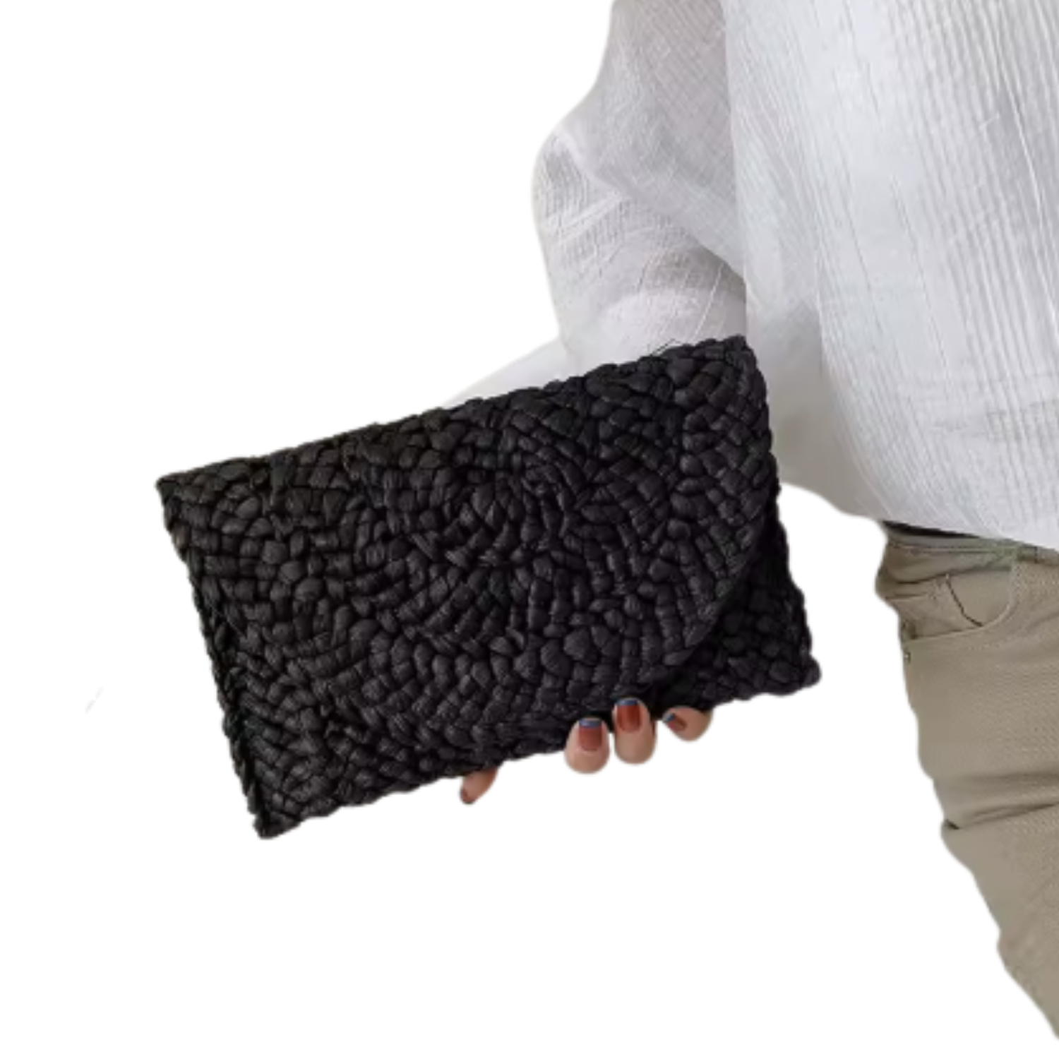 Agrega un toque artesanal y elegante a tus looks de verano con este bolso tipo sobre tejido a mano. Su diseño bohemio y natural lo convierte en el accesorio perfecto para tus días de playa, vacaciones o salidas casuales.